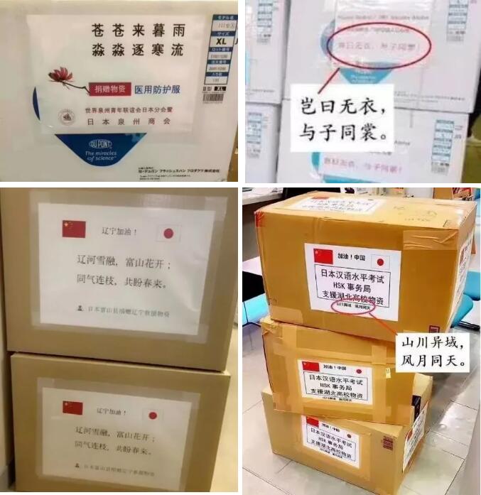 日本株式會社捐贈了3300套防護服、6000雙鞋套、賦詞豈日無衣,與子同裳。富山縣向友好省縣遼寧省捐贈了一萬枚口罩,上面寫著:遼河雪融,富士花;同氣連枝,共盼春來。HSK事務所捐贈了兩萬枚口罩,上面寫著:山川異域,風月同天。