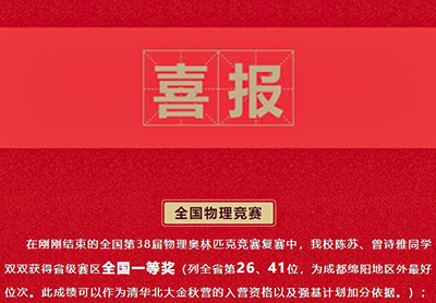 在剛剛結(jié)束的全國第38屆物理奧林匹克競賽復(fù)賽中,我校陳蘇、曾詩雅同學(xué)雙雙獲得省級賽區(qū)全國一等...