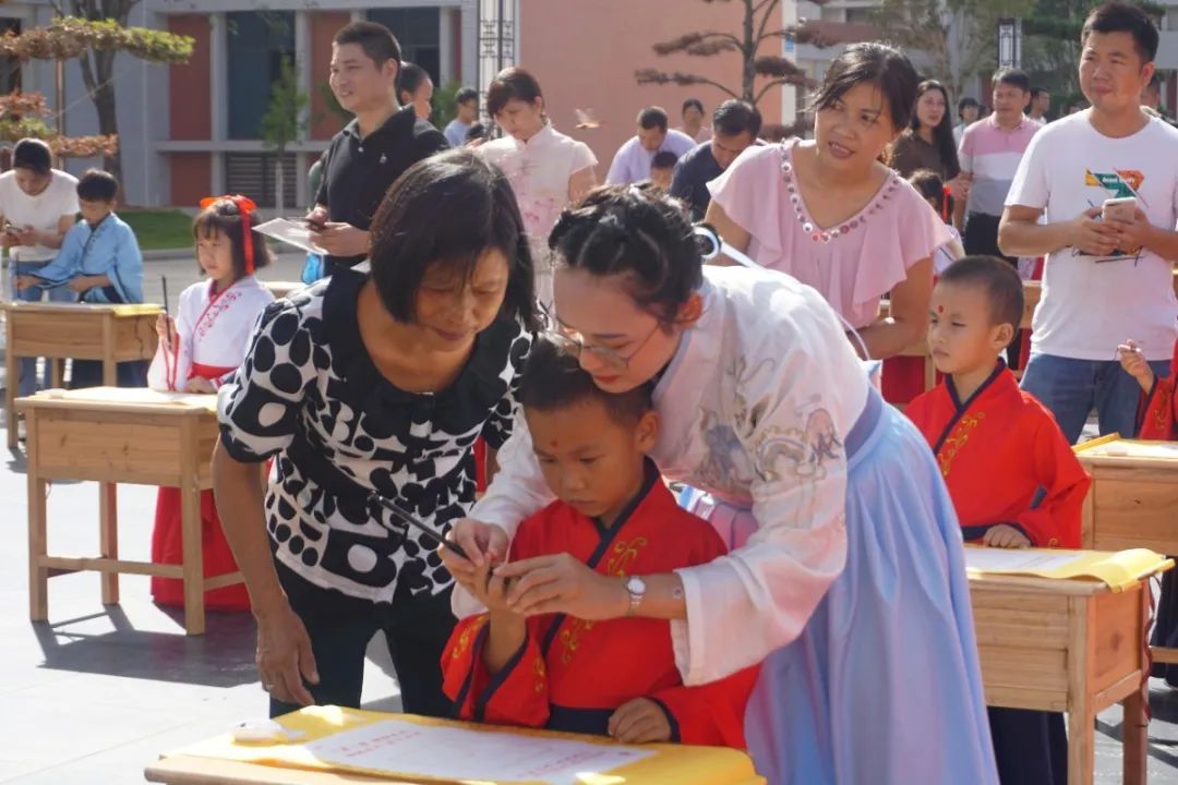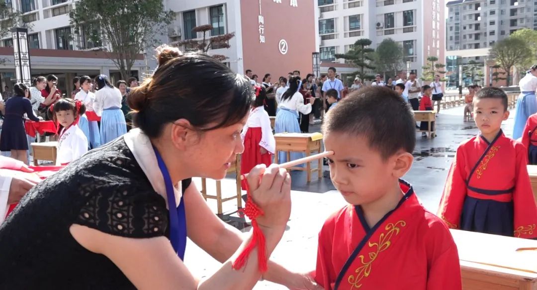 點朱啟智,心明眼亮,景行唯圣,教倫無痕。師者用筆粘上朱砂,于孩子眉心之上輕輕一點,謂之“點智破蒙”,寓意開啟智慧,推開知識的大門,祈愿新生們從此心明眼亮,好好讀書,端正品行,健康成長。