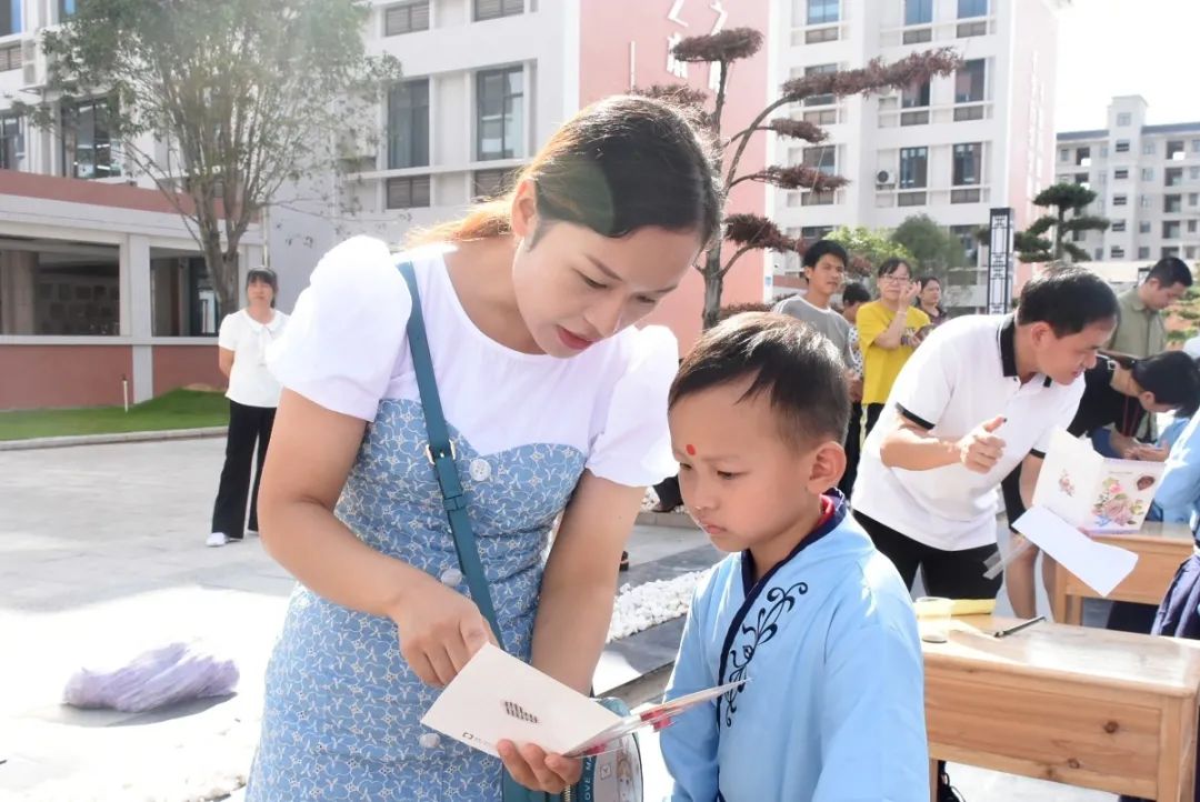 碧空如洗,秋高氣爽。為弘揚中華傳統(tǒng)文化精神,9月16日上午,大余衡水實驗學(xué)校隆重舉行“開蒙啟智 習(xí)禮明德”一年級新生開筆禮儀式。大余衡水實驗學(xué)校校長王躍平,副校長彭艷華,小學(xué)部校長鐘小娟,校長助理簡東英,小學(xué)部教務(wù)主任謝林燕、副主任黃婷,以及一年級全體新生家長和老師共同見證了此次莊重的開筆禮儀式。