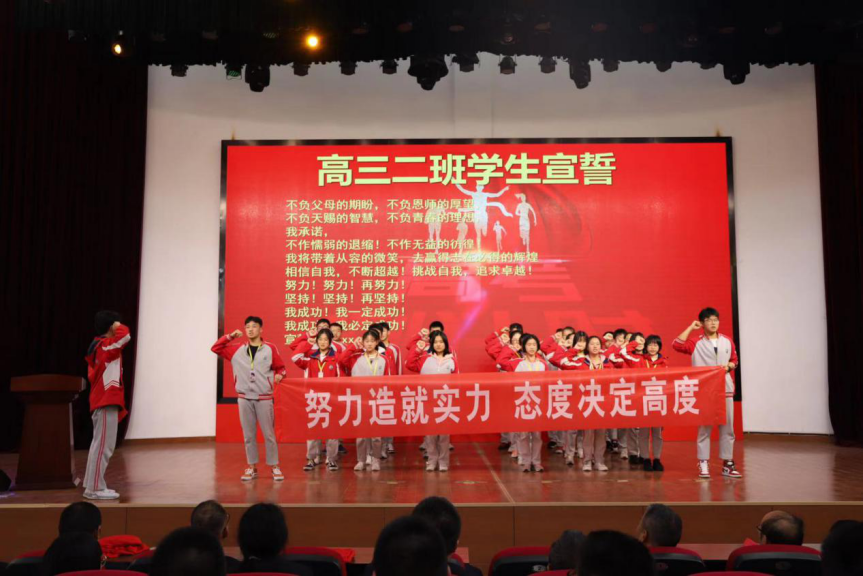 各班學(xué)生分別宣誓 高三年級的四個班級逐一上臺,為全體師生展現(xiàn)本班的風(fēng)采。“同闖崢嶸十春秋,共創(chuàng)輝煌佳年華”“努力造就實力,態(tài)度決定高度”“貴在堅持、難在堅持、成在堅持”,聽啊,這就是高三學(xué)子的聲音,更是高三學(xué)子面對高考大關(guān)的無盡信心。