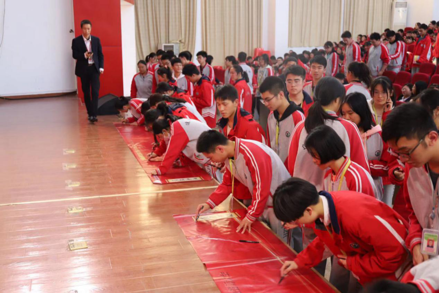 各班學(xué)生分別到臺前簽名,表達(dá)自己的雄心壯志,堅持砥礪前行。一個個形各異卻志相同的名字仿佛在無聲地宣告同學(xué)們必定將努力落實在行動上的決心。