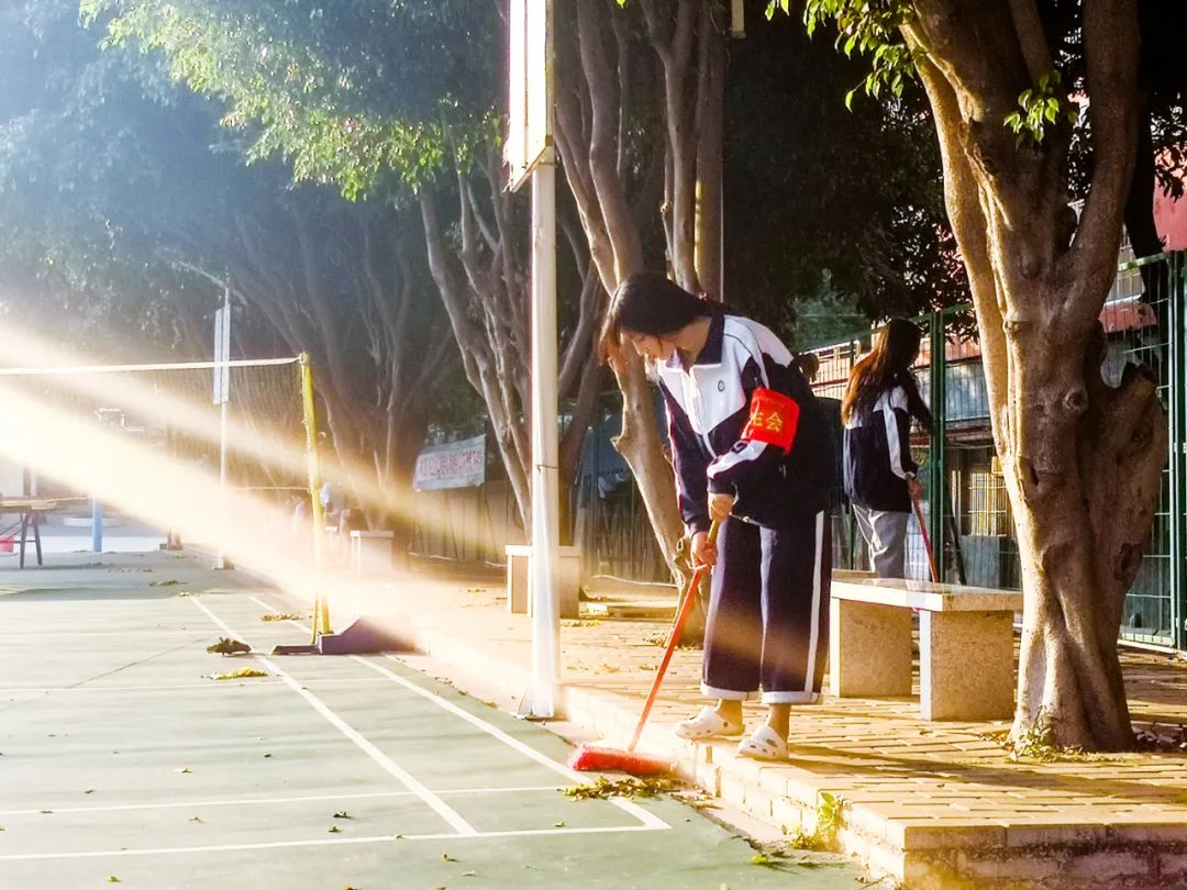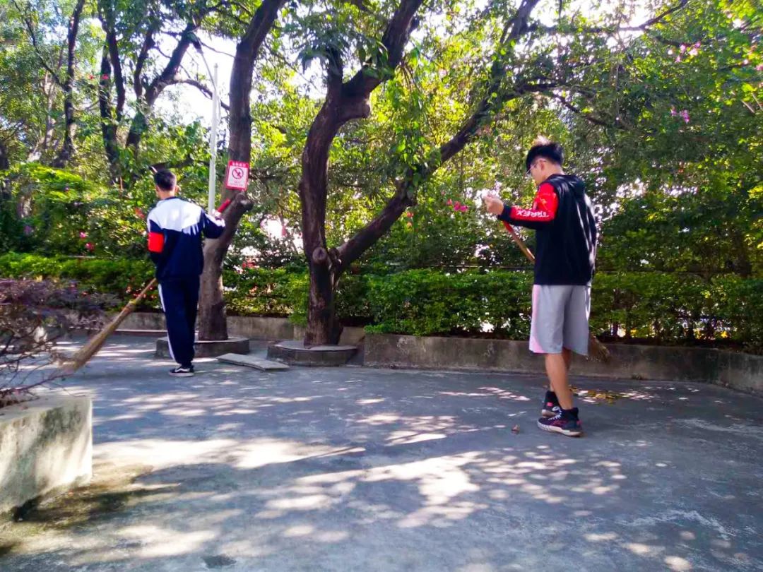 提前到達(dá)操場(chǎng)的是王廷榮、黃詩(shī)文、李仁懷、李燦彬、溫善媛等同學(xué)。他們揮動(dòng)著掃把便開(kāi)始“沙沙”地清掃落葉,掃地的聲音好像鳥(niǎo)兒在對(duì)他們唱歌,又像是在鼓勵(lì)他們:“勞動(dòng)的孩子最美麗”。