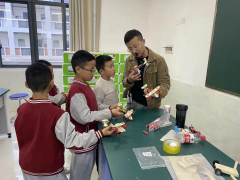 有一些語數課上的“笨孩子”,在科學大課堂上非?;钴S,在完成任務的基礎上還樂于幫助其他同學,課后也會常常找柴老師詢問關于制作方面的問題。除了講授每個小制作的原理,教學生組裝最基礎的零件,柴老師還別出心裁,將原來滑翔機上的零件拆下來改造成了水上自由漂浮的小船。這讓學生對這些小制作更感興趣,原來只要簡單地轉化一下思維,稍加改動,就可以變成新的小玩意兒。